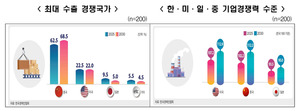 [CEONEWS=김병조 기자] 우리나라의 10대 수출 주력업종의 기업경쟁력이 2030년에는 전 부문 중국에 뒤처질 것이라는 전망이 나왔다. 한국경제인협회(이하 한경협)는 10대 수출 주력업종을 영위하는 매출액 1,000대 기업을 대상(200개사 응답)으로 한 「한·미·일·중 경쟁력 현황 및 전망 조사주」를 통해 이같이 밝혔다. 우리나라의 10대 수출 주력업종은 반도체, 디스플레이, 전기전자(컴퓨터, 무선통신기기, 가전), 자동차 및 자동차부품, 일반기계, 선박, 이차전지, 선박, 석유화학 및 석유제품(석유화학, 석유제품), 바이오헬