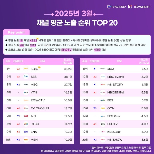 스포츠 채널의 순위도 상승했다. 2025 KBO 리그 개막과 SPOTV의 전월 대비 노출 순위가 4계단 상승했다.