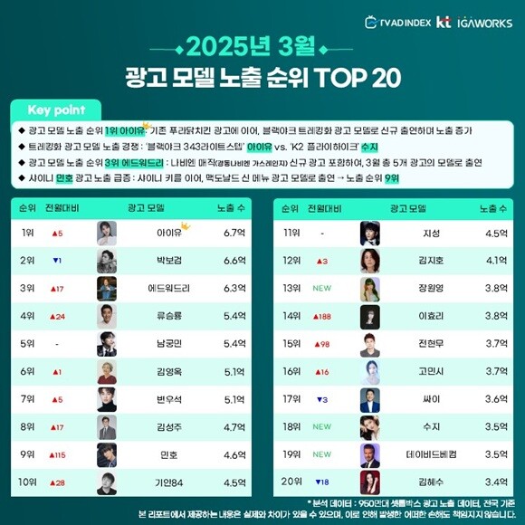 ▲2025년 3월 광고 모델 노출 순위 TOP20