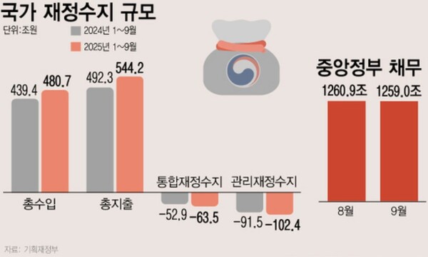 올해 9월 기준, 한국의 관리재정수지 적자가 100조원을 넘어섰다. 세수 부진과 복지성 지출 확대가 겹치며, 나라살림이 급속히 악화되고 있다.