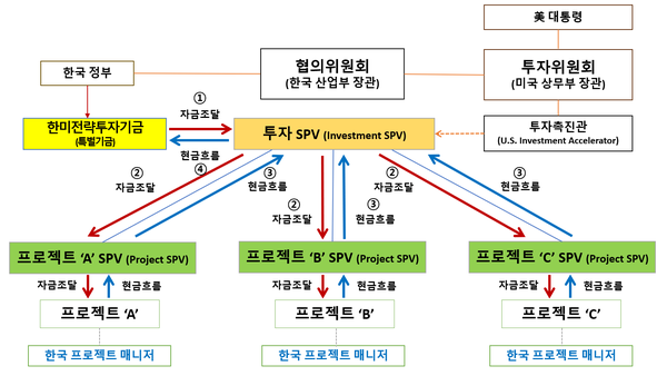 미국은 전체 프로젝트 관리를 위한 ‘투자 SPV(특수목적법인 : Special Purpose Vehicle)’를 설립하고, 개별 프로젝트별로 ‘프로젝트 SPV’를 설립한다.