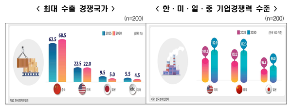 한국의 기업경쟁력을 100으로 가정하고 미국, 일본, 중국의 기업경쟁력 수준을 묻는 질문에 대해 기업들은 2025년 현재에는 미국 107.2, 중국 102.2, 일본 93.5라고 응답했고, 2030년에는 미국 112.9, 중국 112.3, 일본 95.0으로 전망했다.