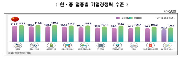 한국의 업종별 기업경쟁력을 100으로 보고, 중국과의 업종별 기업경쟁력을 비교해보면, 2025년 현재 중국은 철강(112.7), 일반기계(108.5), 이차전지(108.4), 디스플레이(106.4), 자동차/부품(102.4) 등 5개 업종에서 한국보다 경쟁력이 높은 것으로 나타났다. 반면, 반도체(99.3), 전기/전자(99.0), 선박(96.7), 석유화학/석유제품(96.5), 바이오헬스(89.2) 등 5개 업종은 한국의 경쟁력이 높은 것으로 조사되었다.