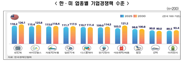 한국의 업종별 기업경쟁력을 100으로 보고, 미국과 비교한 결과, 2025년 현재 한국이 미국보다 경쟁력이 앞선 분야는 철강(98.8), 선박(90.8), 이차전지(89.5) 등의 3개 업종에 불과했다. 그 외 나머지 반도체(118.2), 바이오헬스(115.4) 등 7개 업종에서는 미국이 우위를 보였다.