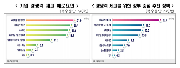 기업들은 경쟁력 제고의 주요 걸림돌로 ‘국내 제품경쟁력 약화’(21.9%)와 ‘대외리스크 증가’(20.4%)를 꼽았다. 이어 ‣인구감축 등에 따른 내수 부진(19.6%) ‣AI 등 핵심기술인력 부족(18.5%) ‣ 경쟁국 대비 낙후된 노동시장 및 기업법제(11.3%) 등을 지적했다.