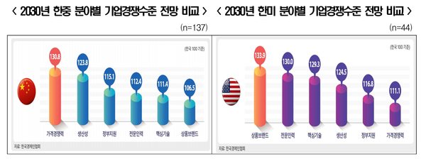 2030년에는 ‣가격경쟁력(130.8) ‣생산성(123.8) ‣정부지원(115.1) ‣전문인력(112.4) ‣핵심기술(111.4) ‣상품브랜드(106.5)로 답했다. 한경협은 이같은 조사결과를 두고 “현재 한국은 6개 분야 중 상품브랜드에서만 중국에 비교우위가 있는데, 5년 후에는 이마저도 중국에 밀릴 것으로 보인다”고 우려했다.